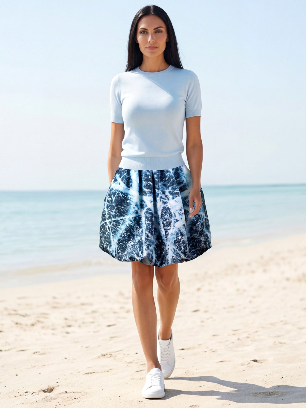 Motiv připomínající ledové střepy působí moderně a energicky. Světle modré a bílé odstíny vytvářejí výrazný kontrast, který v pohybu krásně ožívá. Jemnější střih Bellissima nechává motiv vyniknout a vytváří elegantní siluetu. Skvěle ladí s černým nebo tmavě modrým topem.
