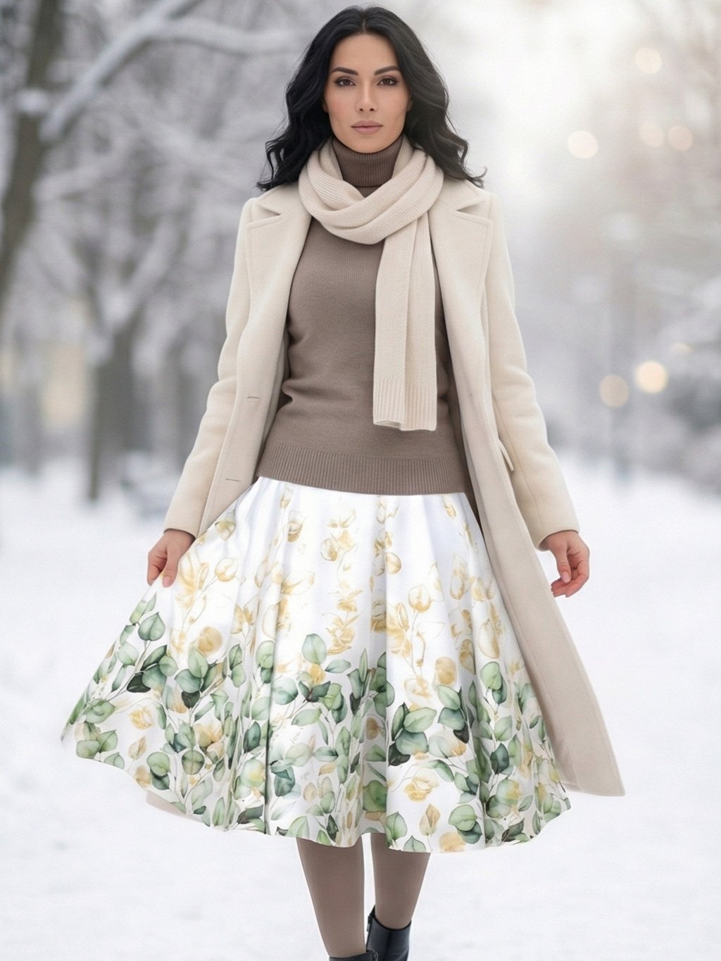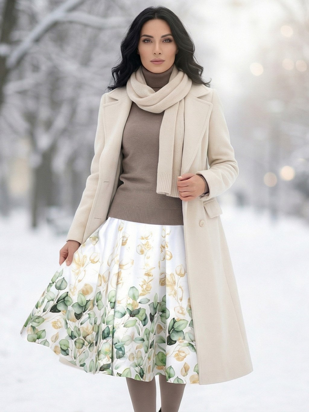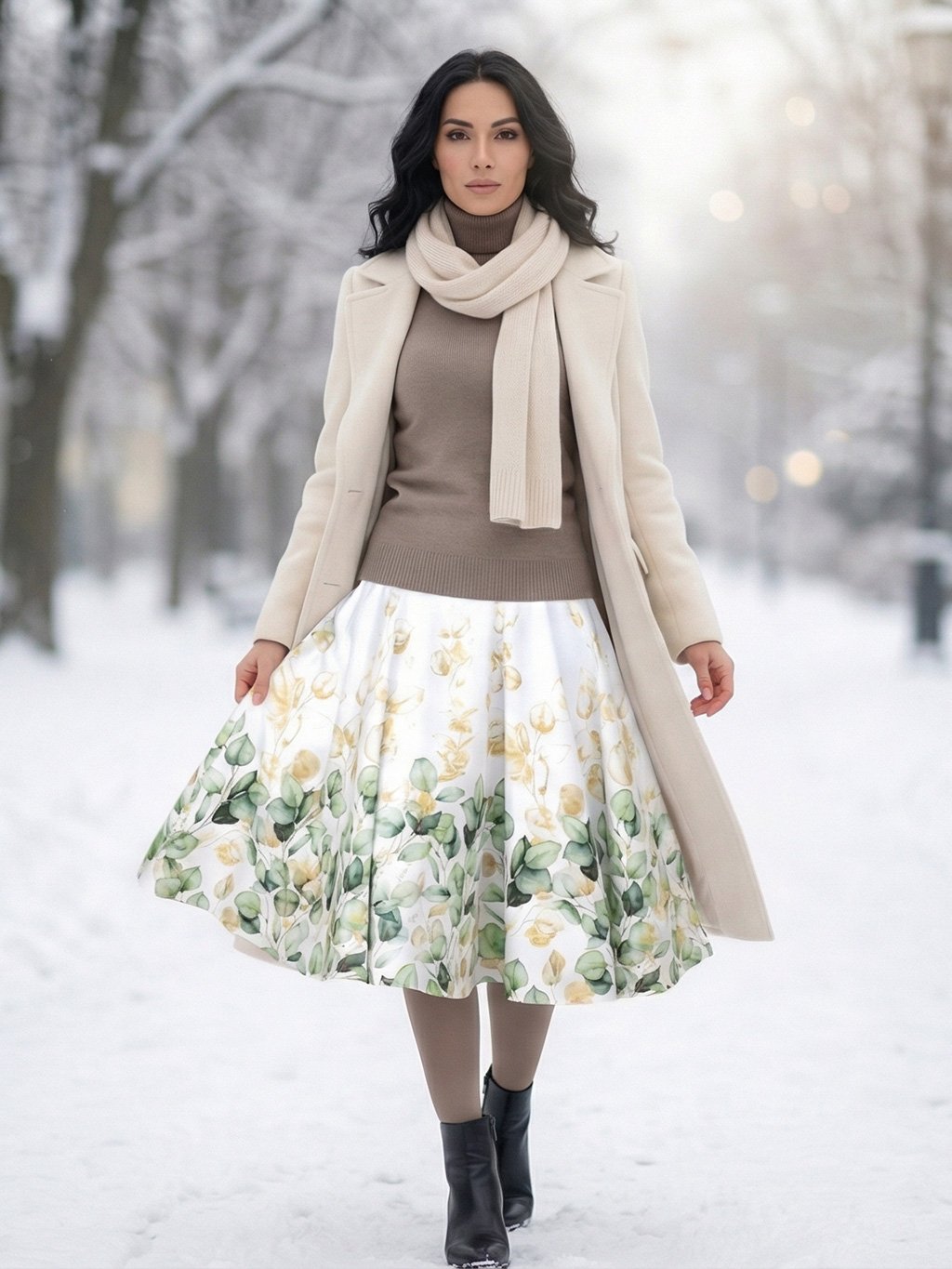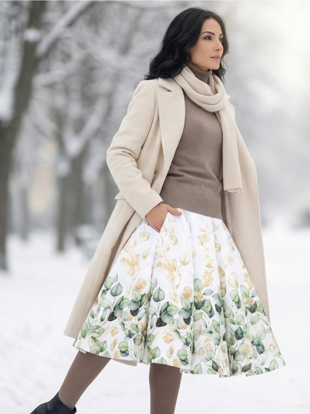 Skvěle vypadá s jednoduchým topem, halenkou nebo svetrem v neutrálních tónech (béžová, krémová, černá, šalvějová). Hodí se k elegantním kabátům, kardiganům i kratším sakům. Díky delší délce působí velmi žensky i s kozačkami nebo lodičkami, ale zvládne i ležérnější kombinaci s teniskami.