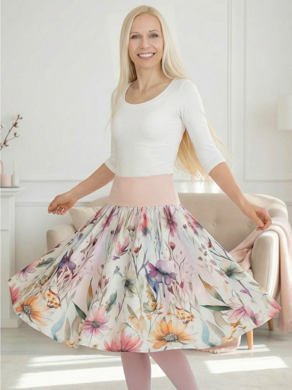 Kolový střih sukně krásně modeluje postavu, v pase nemá žádné nabírání ani řasení, takže opticky kolem pasu nepřidává žádné centimetry navíc. Pokud bychom však sukni rozprostřeli, utvoří materiál kolem dokola plný kruh - sukně je tak směrem dolů opravdu bohatá, vytváří nádherný plný objem a podtrhuje ženské křivky. Krásně se točí.
