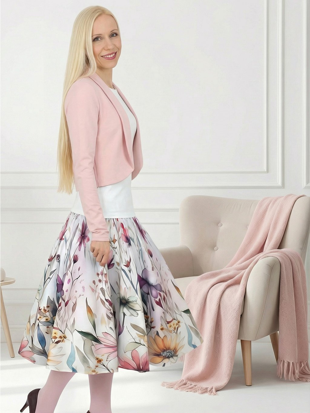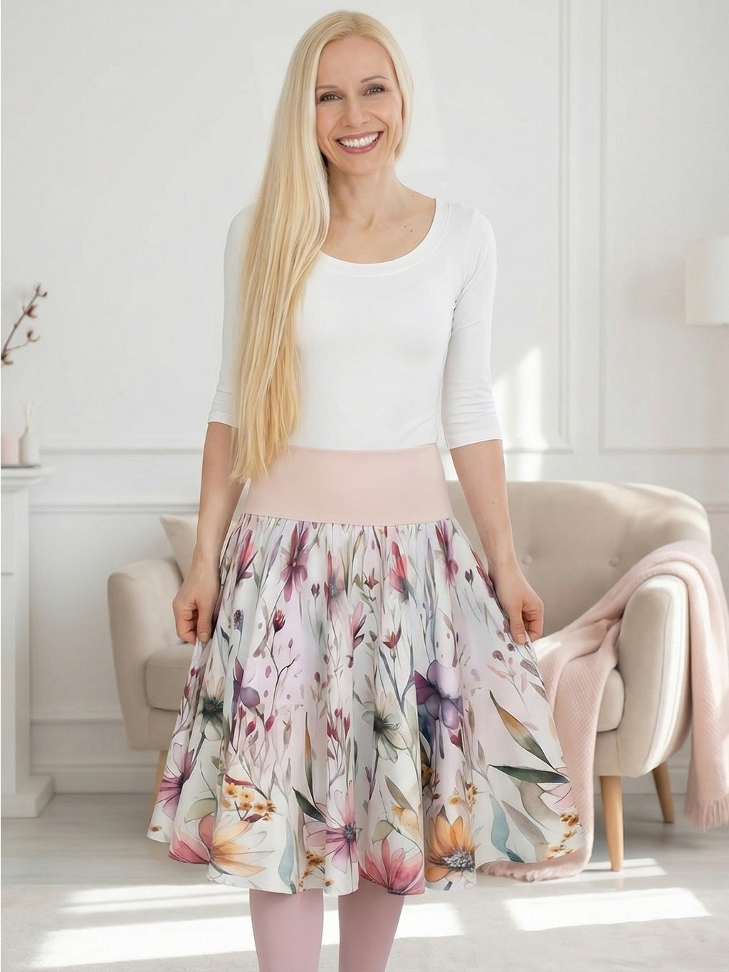 Díky podšívce lze sukni pohodlně nosit na silonky, legíny i na holé nožky. Hodí se pro celoroční nošení. Celková délka sukně je 68 cm včetně nápletu v pase.
