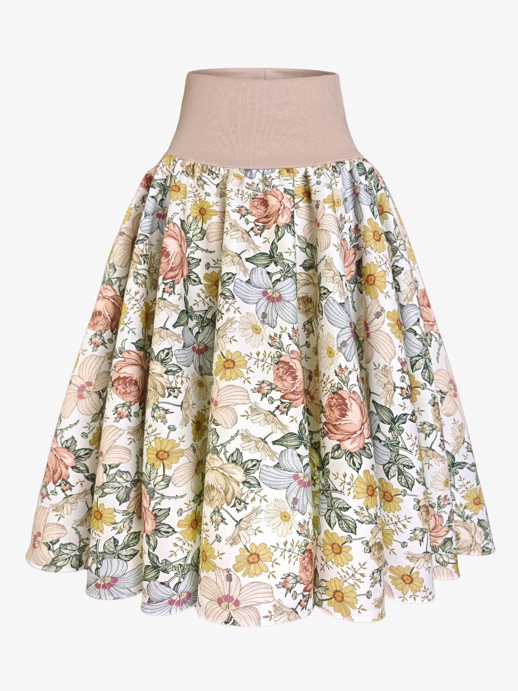 Kolová sukně AMELIA Pudrová krása v sobě nese jemnost, která působí přirozeně a klidně, a přesto zanechává silný dojem. Tlumené pudrové tóny v kombinaci s něžným květinovým motivem vytváří harmonii, která připomíná staré zahrady zalité měkkým světlem. Vzor nepůsobí okázale, ale spíše jako tichý detail, který postupně odhaluje svou krásu.
