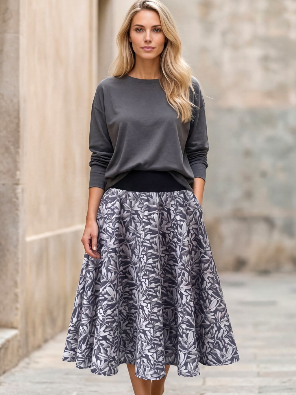 Stříbřité listy na tmavém podkladu působí klidně, vyváženě a velmi kultivovaně. Vzor připomíná jemnou kresbu zachycenou v pohybu a dodává modelu hloubku bez zbytečné výraznosti. Sukně působí nenápadně, ale právě v detailu je její síla. Skvěle se kombinuje s černým, smetanovým nebo jemně šedým topem a vytváří harmonický outfit pro každý den i klidnější společenské příležitosti.