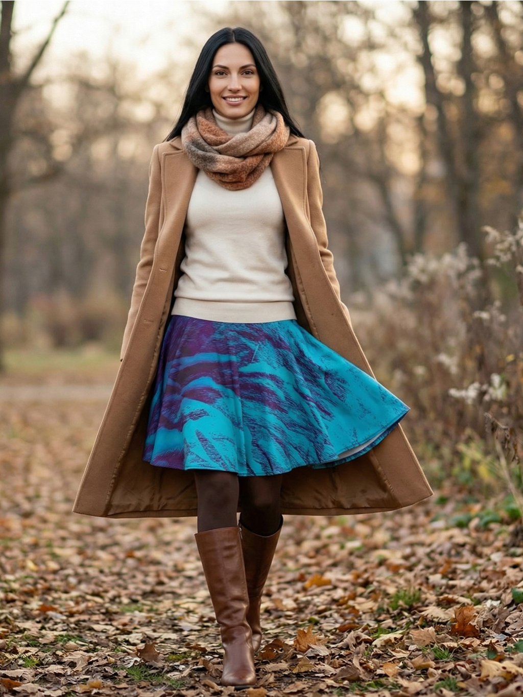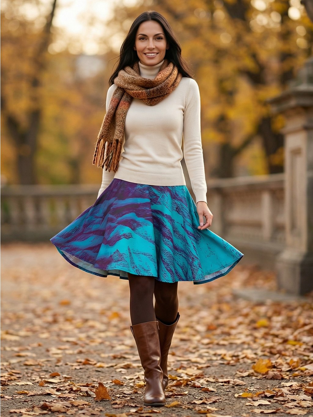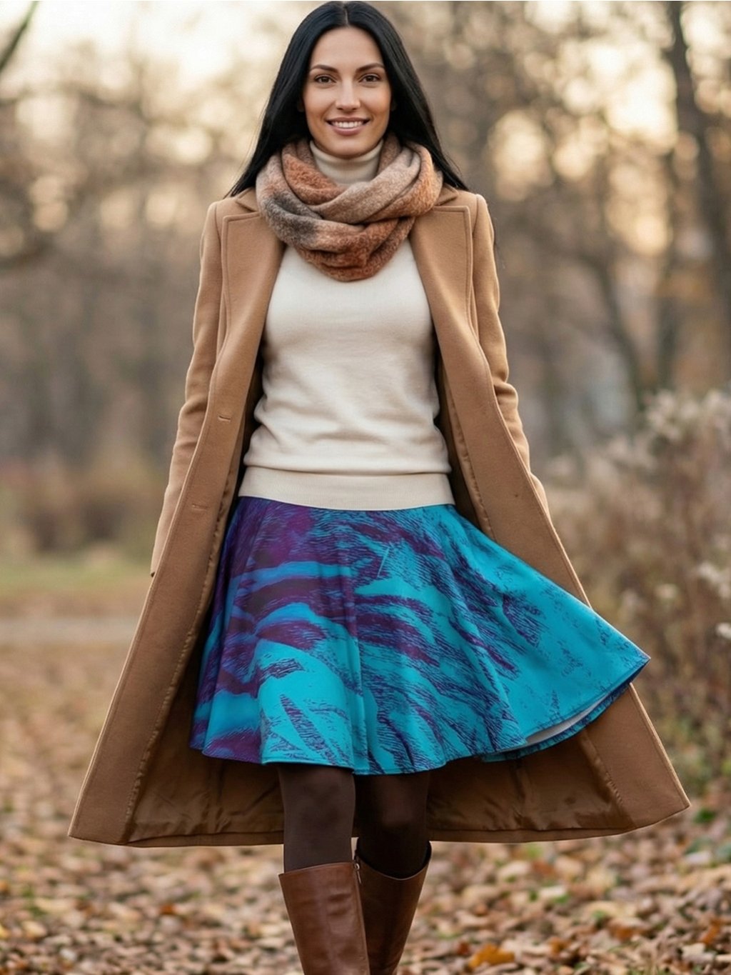 Krásně vynikne s jednobarevným rolákem nebo svetrem (béžová, krémová, tmavě modrá). Skvěle funguje s kabátem rovného střihu nebo minimalistickým sakem. Na podzim a zimu ideální s tmavými punčochami a kozačkami, na jaře i s teniskami. Vzor je výrazný, proto stačí jednoduché doplňky.