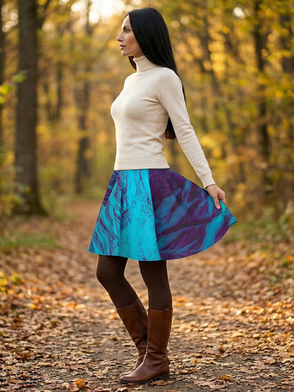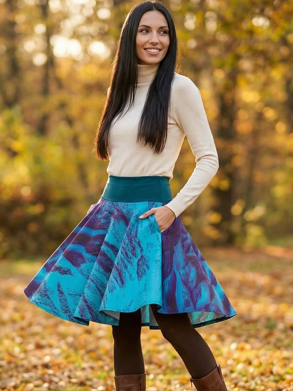 Kolová sukně AMELIA zmačkaný papír zaujme na první pohled svým originálním, strukturovaným vzorem, který připomíná jemně pomačkaný papír. Kombinace tyrkysových a tmavších tónů působí moderně, čistě a překvapivě elegantně. Sukně je ideální volbou pro ženy, které mají rády netradiční vzory, ale zároveň chtějí zůstat u nadčasového stylu, který se snadno kombinuje a neomrzí.