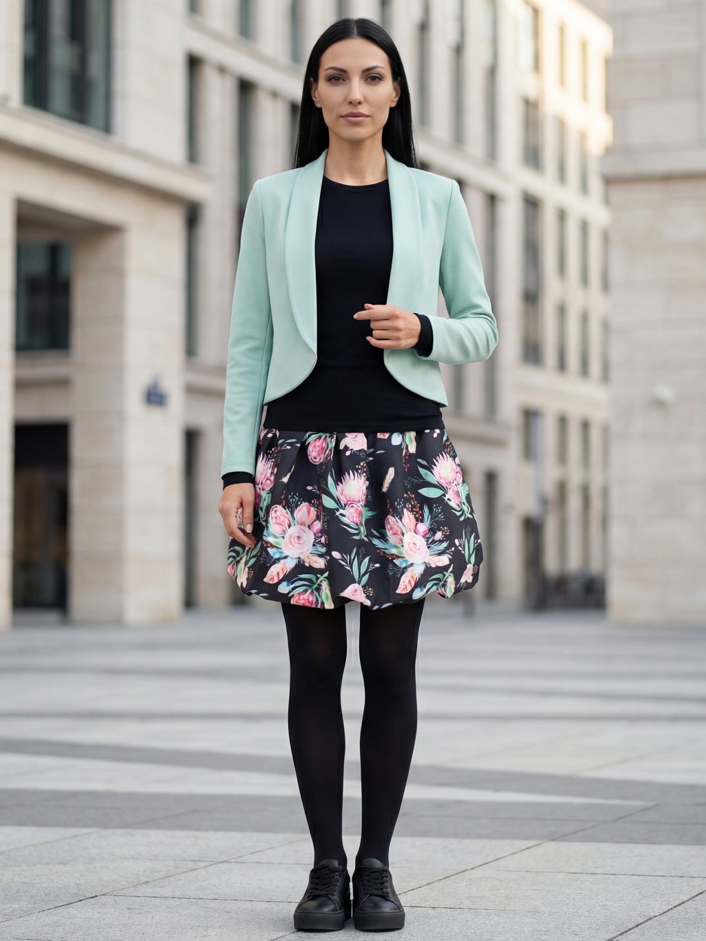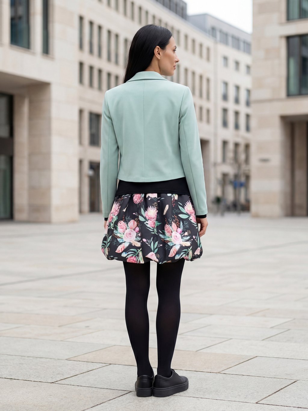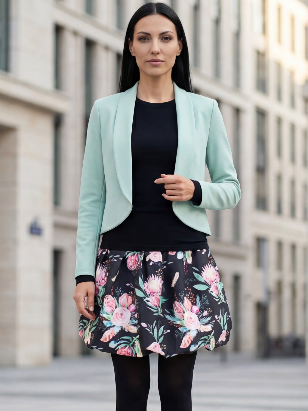 Sako NAYA funguje nejlépe v kombinaci se sukněmi s vyšším objemem, například s balónovými nebo kolovými sukněmi. Kratší délka krásně pracuje s proporcemi postavy a podtrhuje siluetu bez potřeby projmutí nebo tvarování.