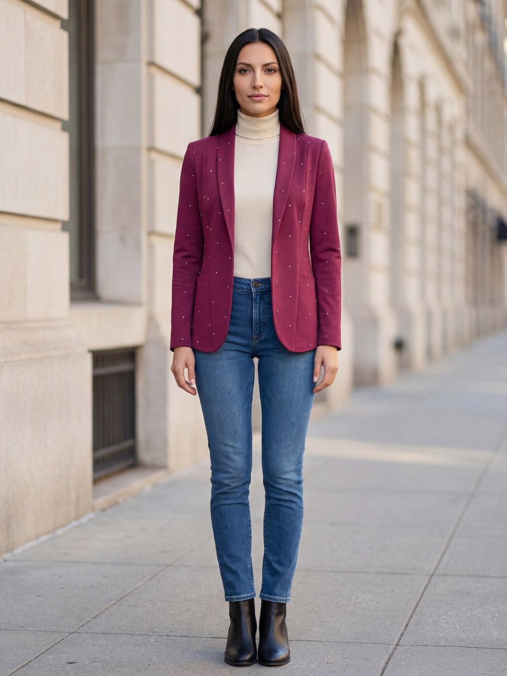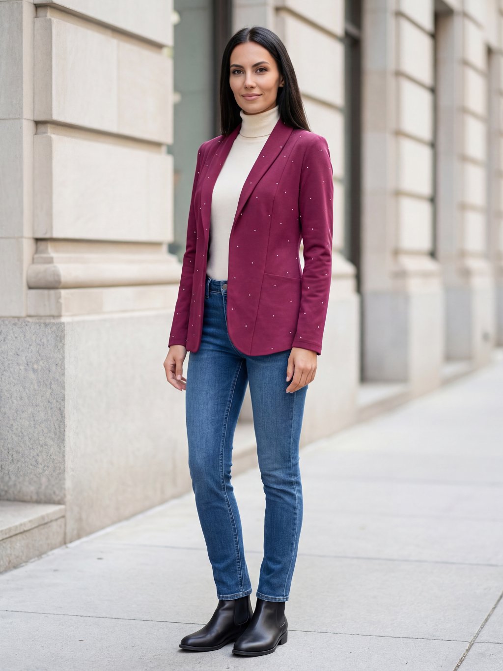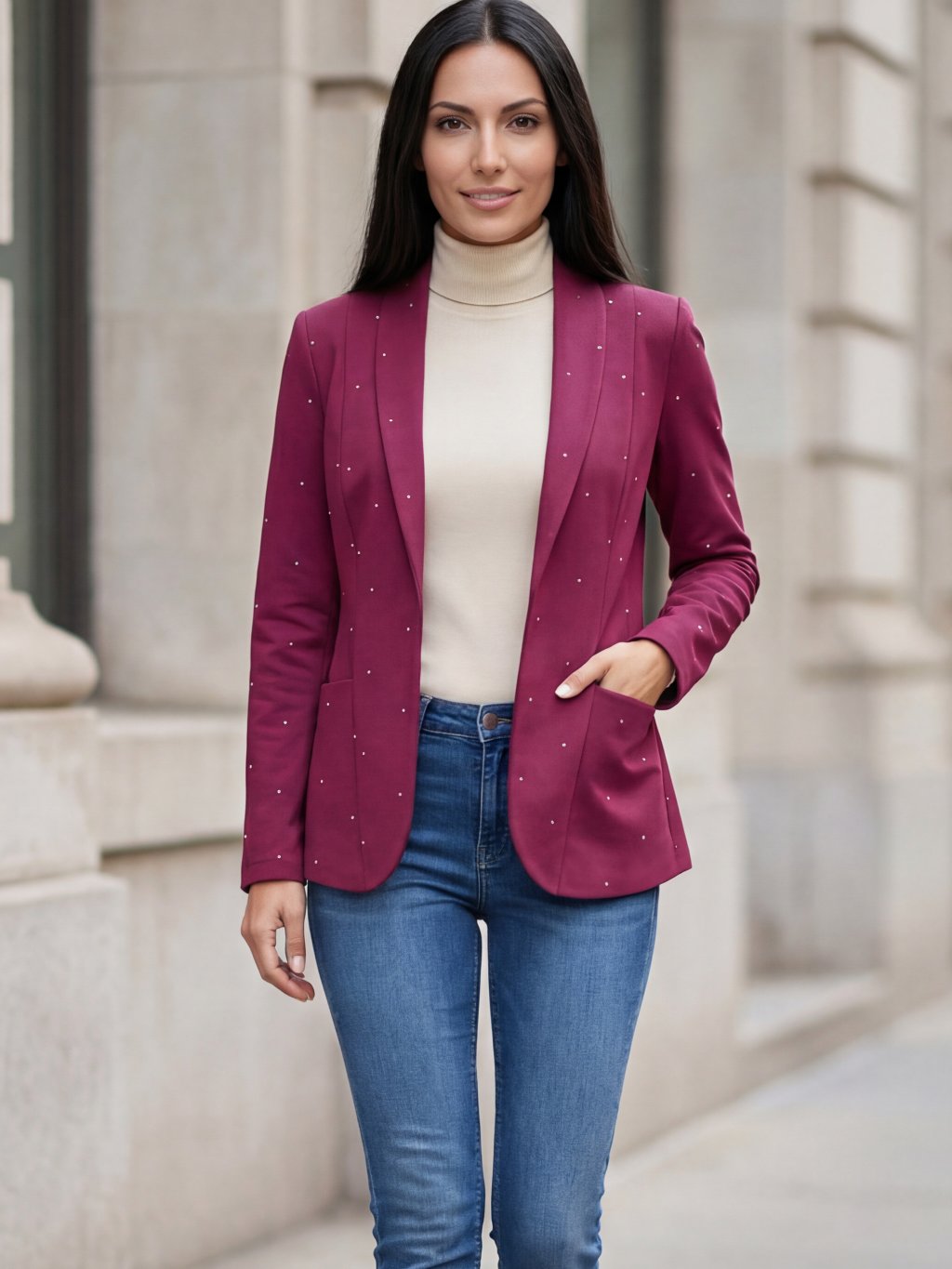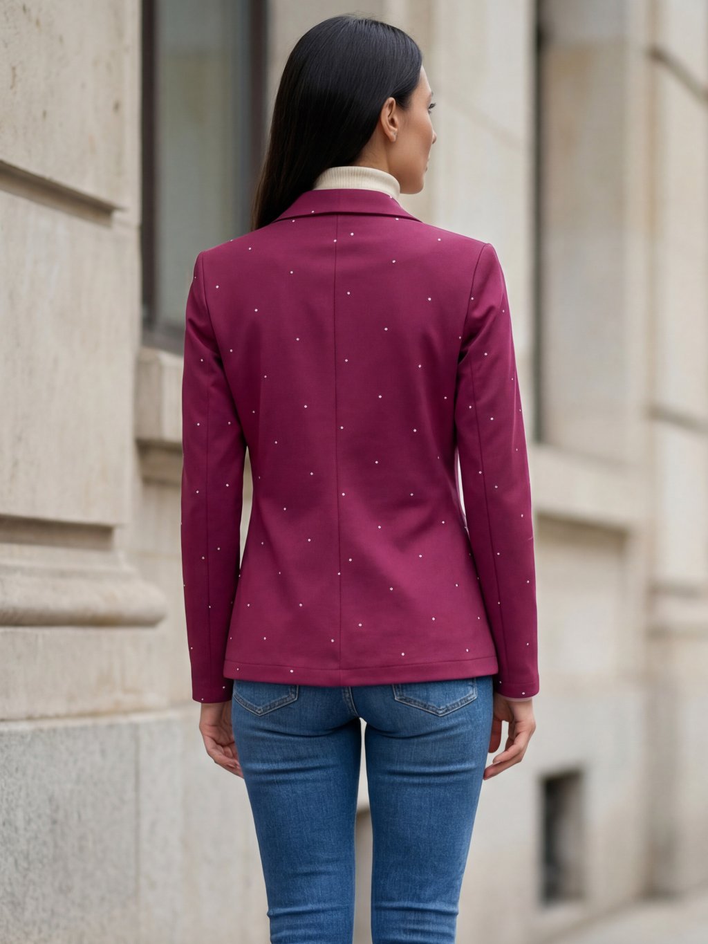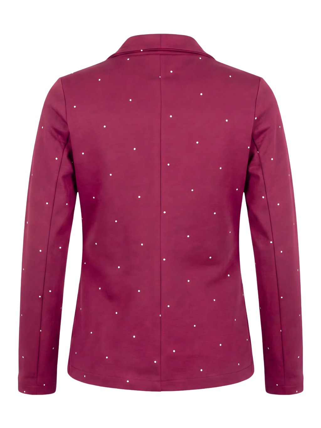 👉 Tón: Sako Hey Baby v odstínu wine red s drobným bílým puntíkem působí elegantně, žensky a sofistikovaně. Vínový tón v kombinaci s jemným vzorem dodává outfitu hloubku.