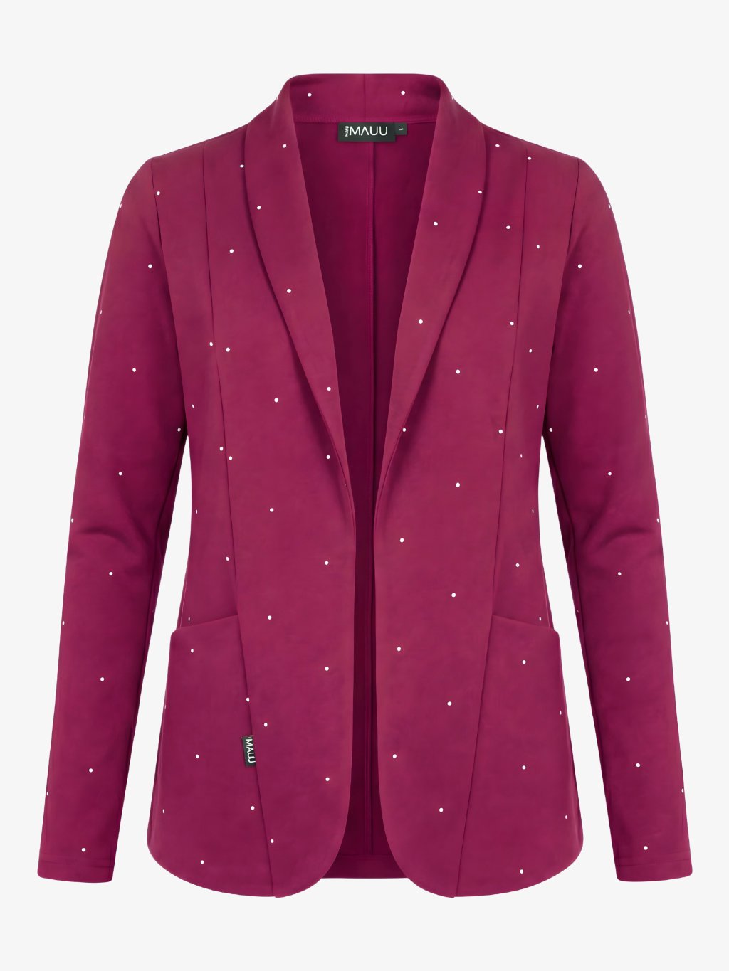 Sako HEY BABY má funkční kapsy chytře zapracované mezi boční šev a klopu - jsou nenápadné, ale praktické. Rukávy jsou dvoudílné, což zajišťuje hezkou linii a lepší tvar než u běžných úpletových sak. Charakteristickým detailem je tkaná cedulka MAUU všitá v přední části mezi klopu a kapsu.