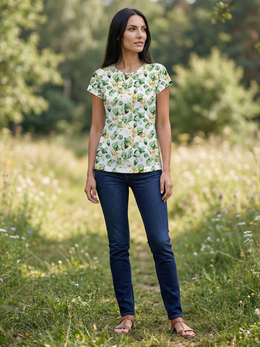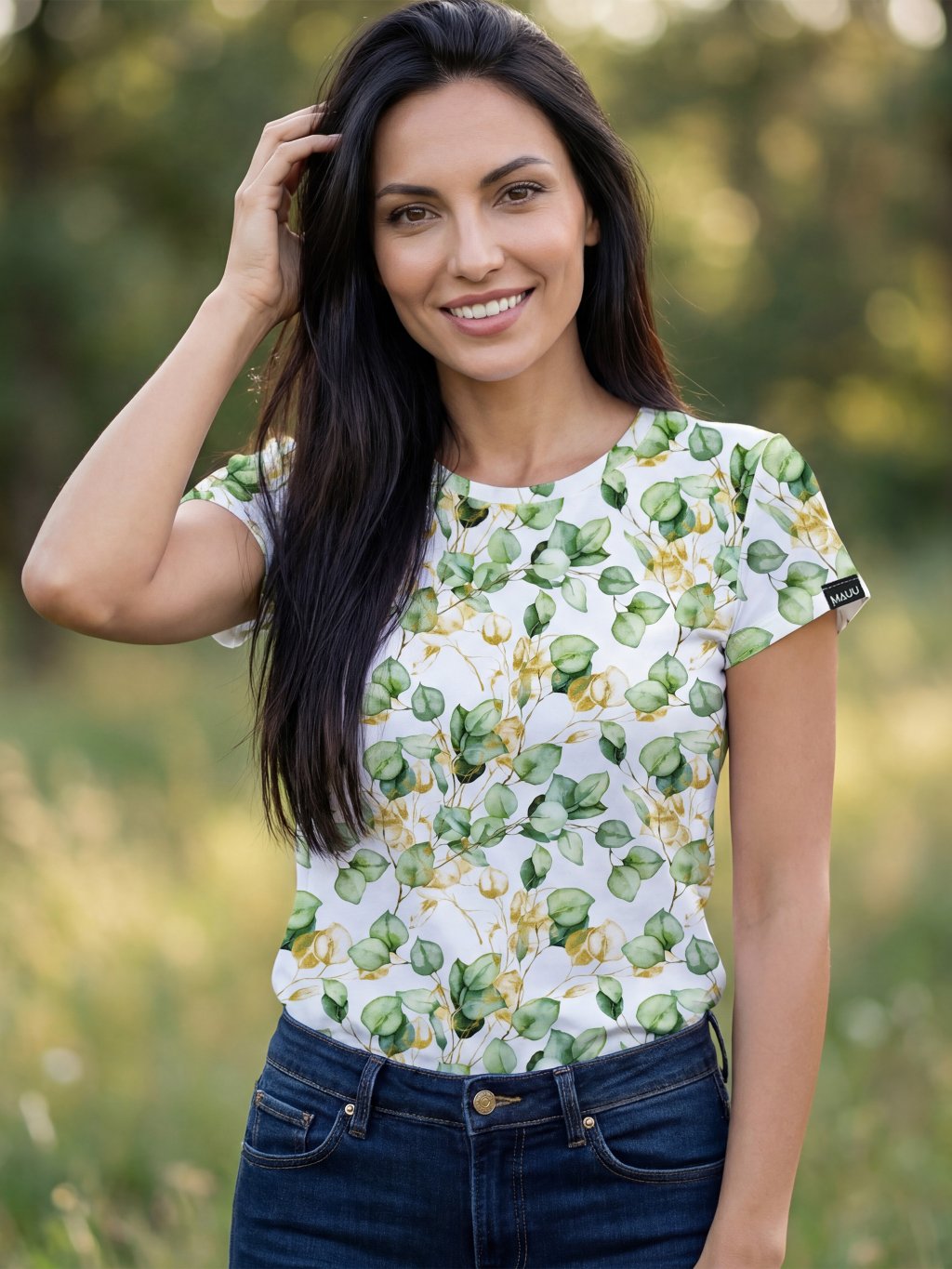 Svěží botanický vzor s jemnými lístky v odstínech zelené a teplých přírodních tónů působí harmonicky, klidně a nadčasově. Eukalyptový motiv připomíná listy v herbáři - lehce akvarelové, vzdušné a přirozené. Díky světlému podkladu je vzor velmi dobře kombinovatelný a opticky projasňuje celý outfit. Skvěle se hodí k džínům, lněným kalhotám i jednobarevným sukním a podtrhuje přirozenou ženskost bez zbytečné okázalosti.