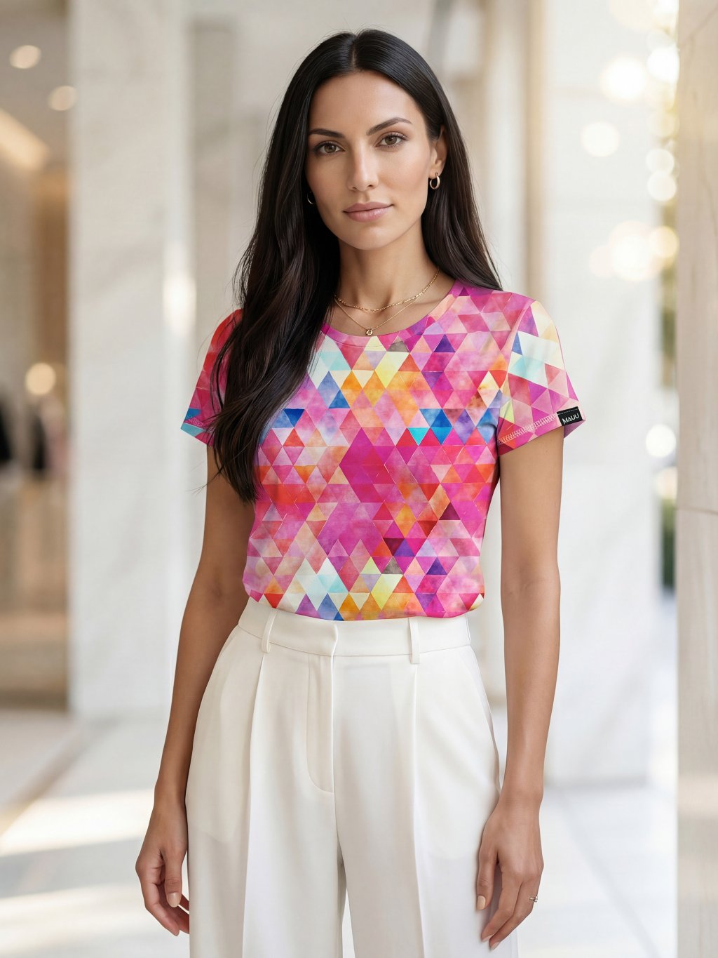Geometrický vzor tvořený drobnými trojúhelníky v odstínech růžové, malinové, korálové a jemné tyrkysové působí svěže, optimisticky a velmi žensky. Akvarelové prolínání barev zjemňuje grafickou strukturu vzoru a dodává mu lehkost a hravost. Mozaika rosé krásně rozzáří outfit, ale nepůsobí křiklavě - skvěle se kombinuje s bílými, krémovými i džínovými kousky a hodí se jak na běžné nošení, tak i do města nebo do práce.