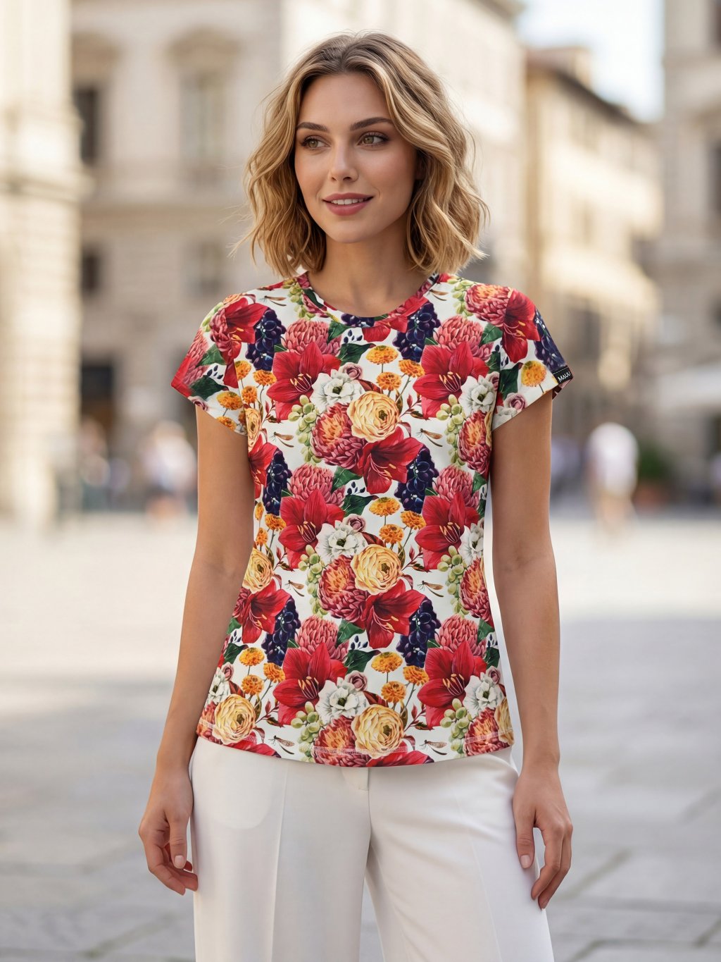 Vzor Plný květ připomíná letní zahradu zalitou teplým světlem - bohaté květy v odstínech červené, vínové, medové a jemné krémové se prolínají s drobnými listy a detaily, které dodávají vzoru hloubku a živost. Celek působí výrazně, ale vyváženě, takže triko nepřebíjí outfit, ale přirozeně ho oživí. Skvěle vynikne s jednoduchými sukněmi i kalhotami a dodá outfitu ženskost, energii a jemný nádech elegance.